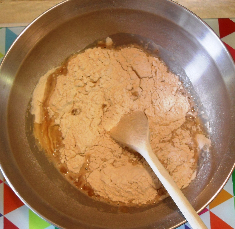 - Sieve the flour and salt into a large bowl and stir in the yeast mixture and the rest of the water with a wooden spoon, you might need a little more water!
