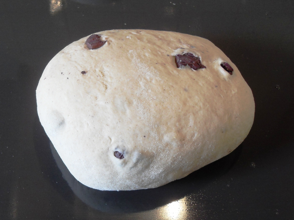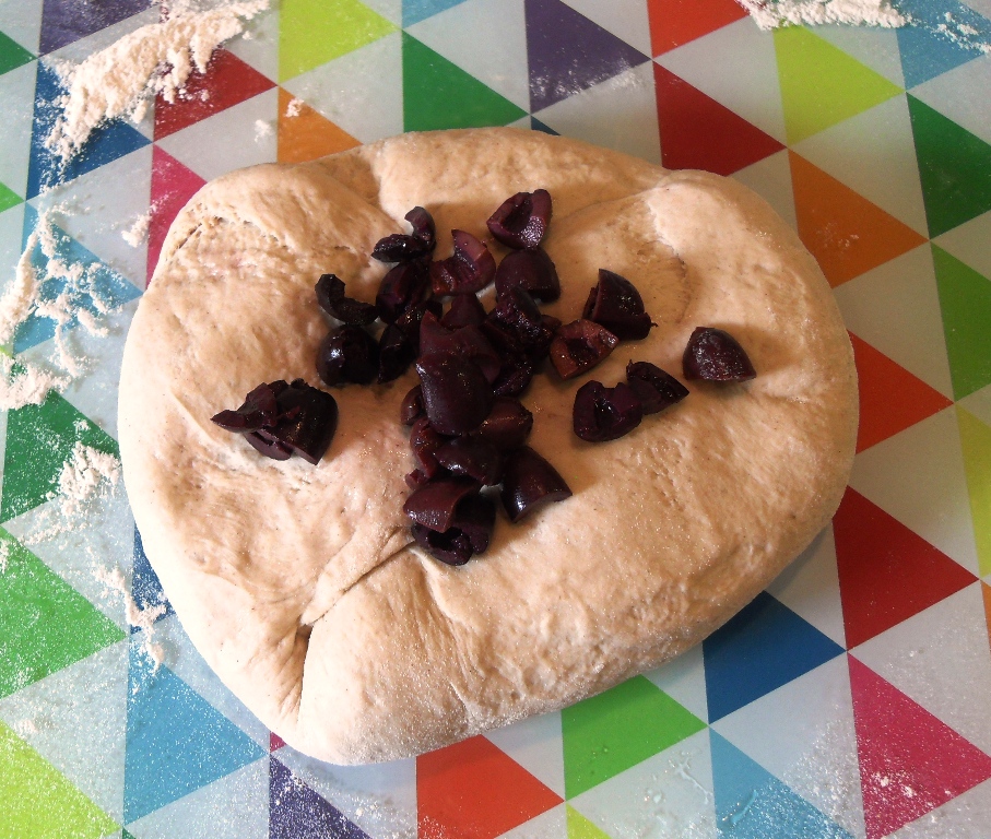 - Turn the dough onto a floured surface, punch down then sprinkle in the chopped olives and knead for a few minutes.(You might need to add in 2 batches).