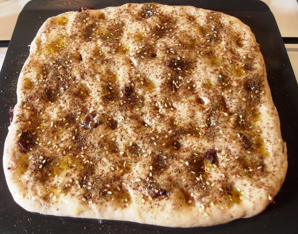 - Make dimples in the dough using your fingers or knuckles then brush the olive oil over the surface and sprinkle on the Za’atar and course sea salt.